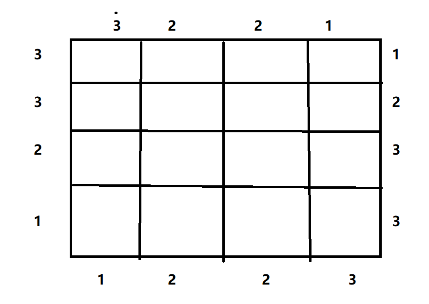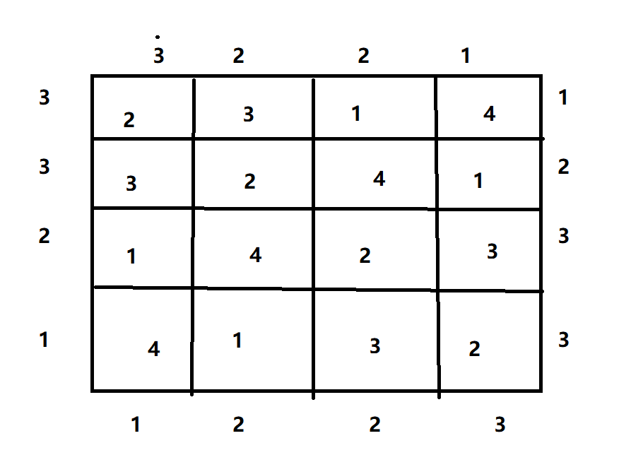 给定一个n*n的矩阵(3<=n<=6),从给定信息中进行填数字,要求任意一行纵列横列不能重复,且数字为能从上边“看到的个数”(例:4 2 3 1 个数为1 2 3 4 1 个数为3) 图例